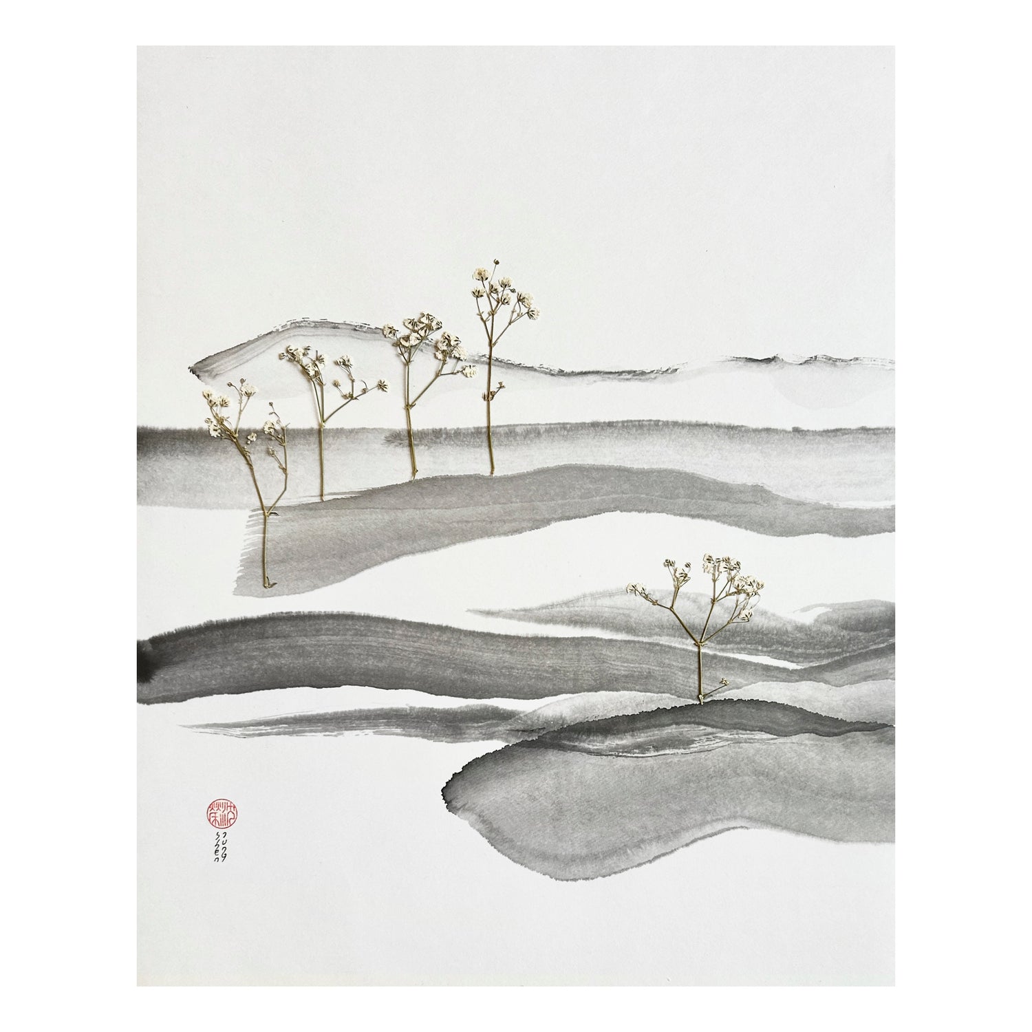 Encre de Chine et fleurs s.ch.es sur papier Xuan - 37 x 47 cm