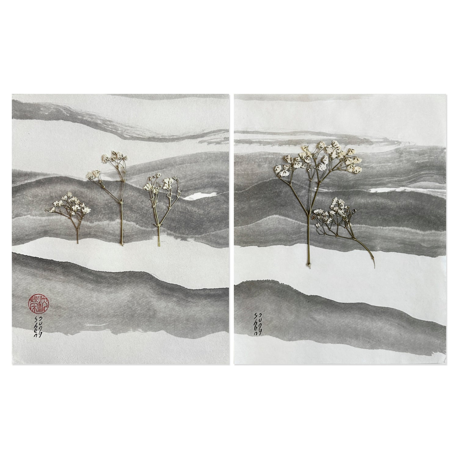 Encre de Chine et fleurs séchées sur papier - 20 x 32 cm en Diptyque