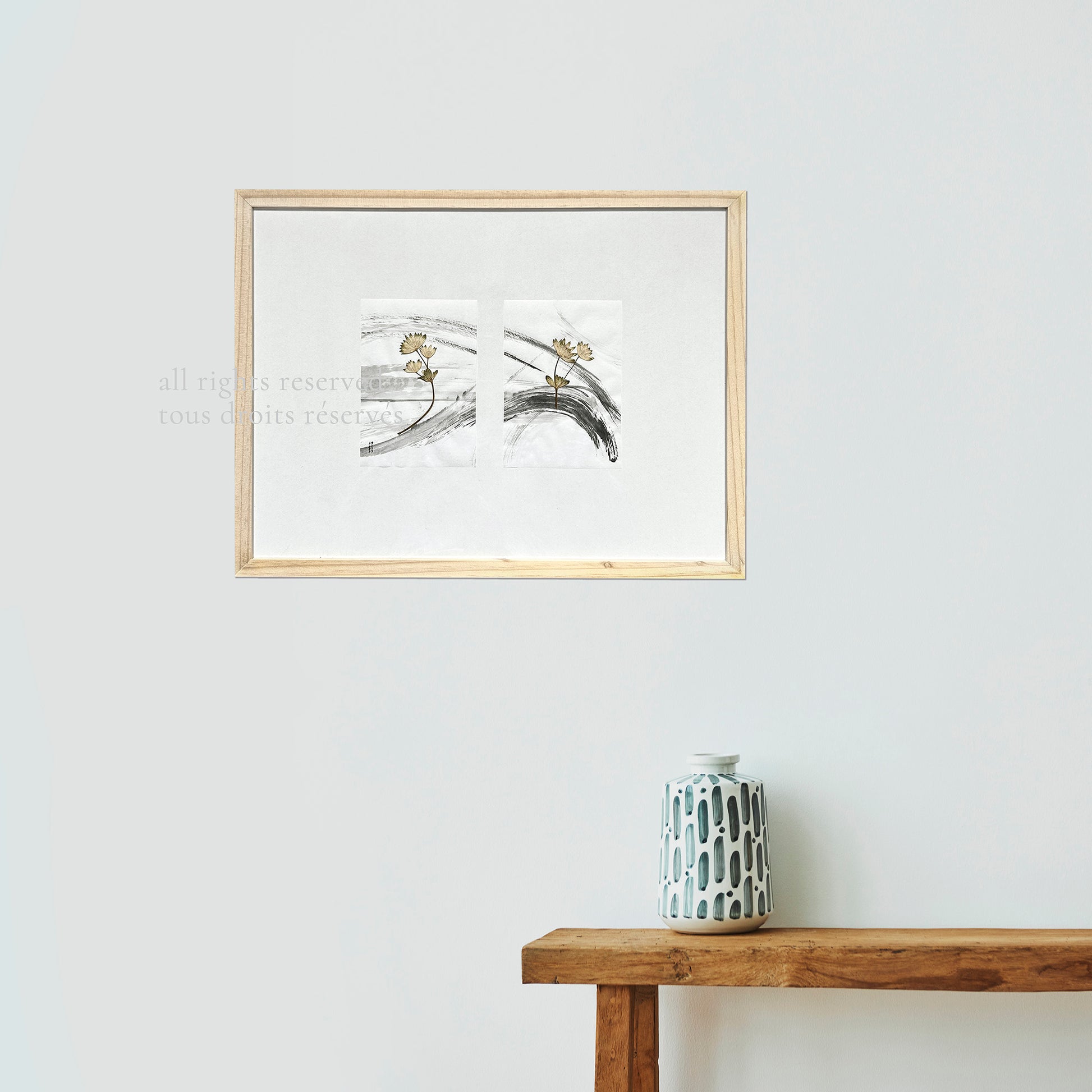 Information sur les œuvres avec fleur séchée. À éviter l’exposition directe au soleil. Les couleurs peuvent évoluer avec le temps — c’est aussi cela qui fait partie de l’expérience et rend cette œuvre vivante.