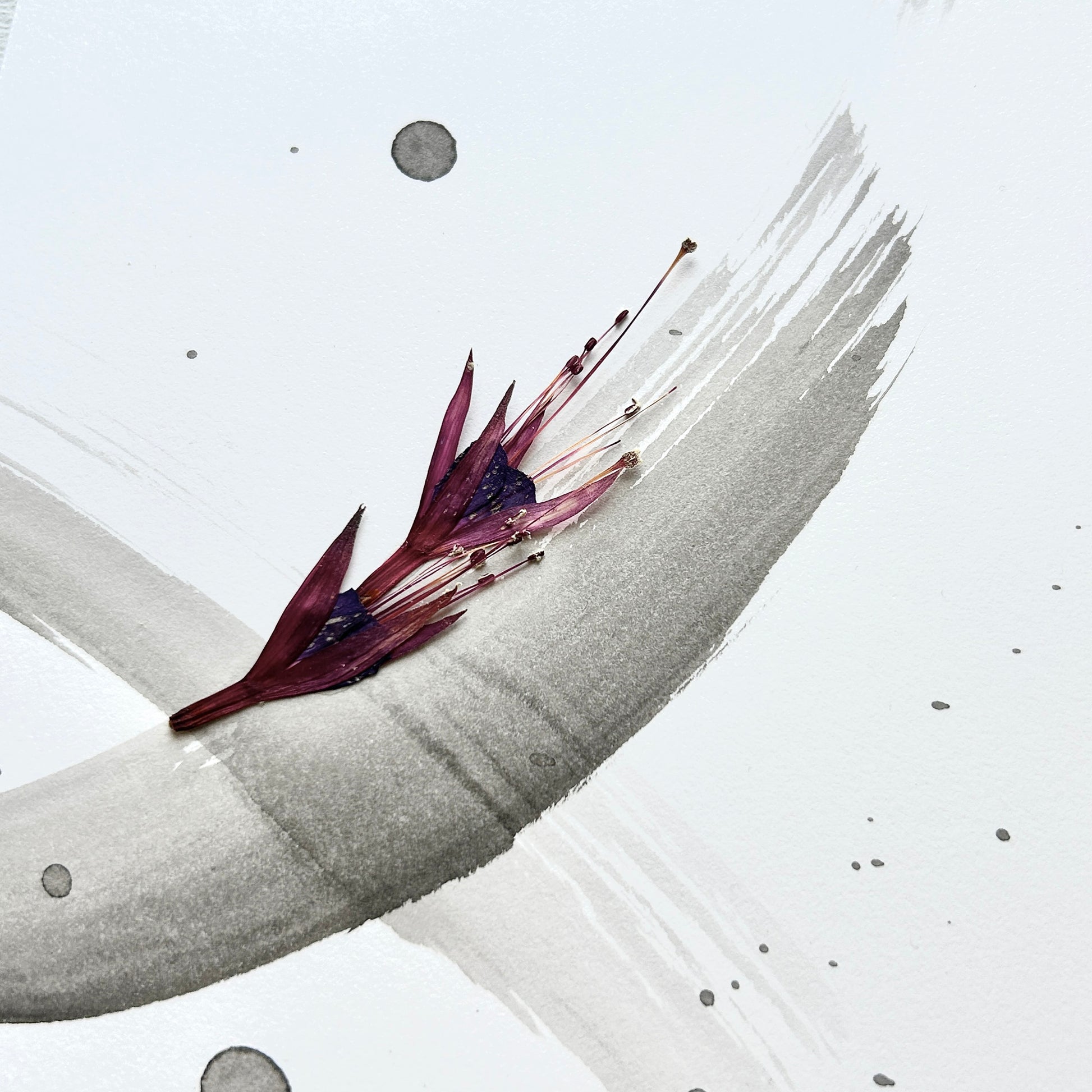 Ces précieuses œuvres allient la délicatesse des fleurs séchées sur un papier de soie à la spiritualité de l'encre de Chine ou Sumi-e japonaise.