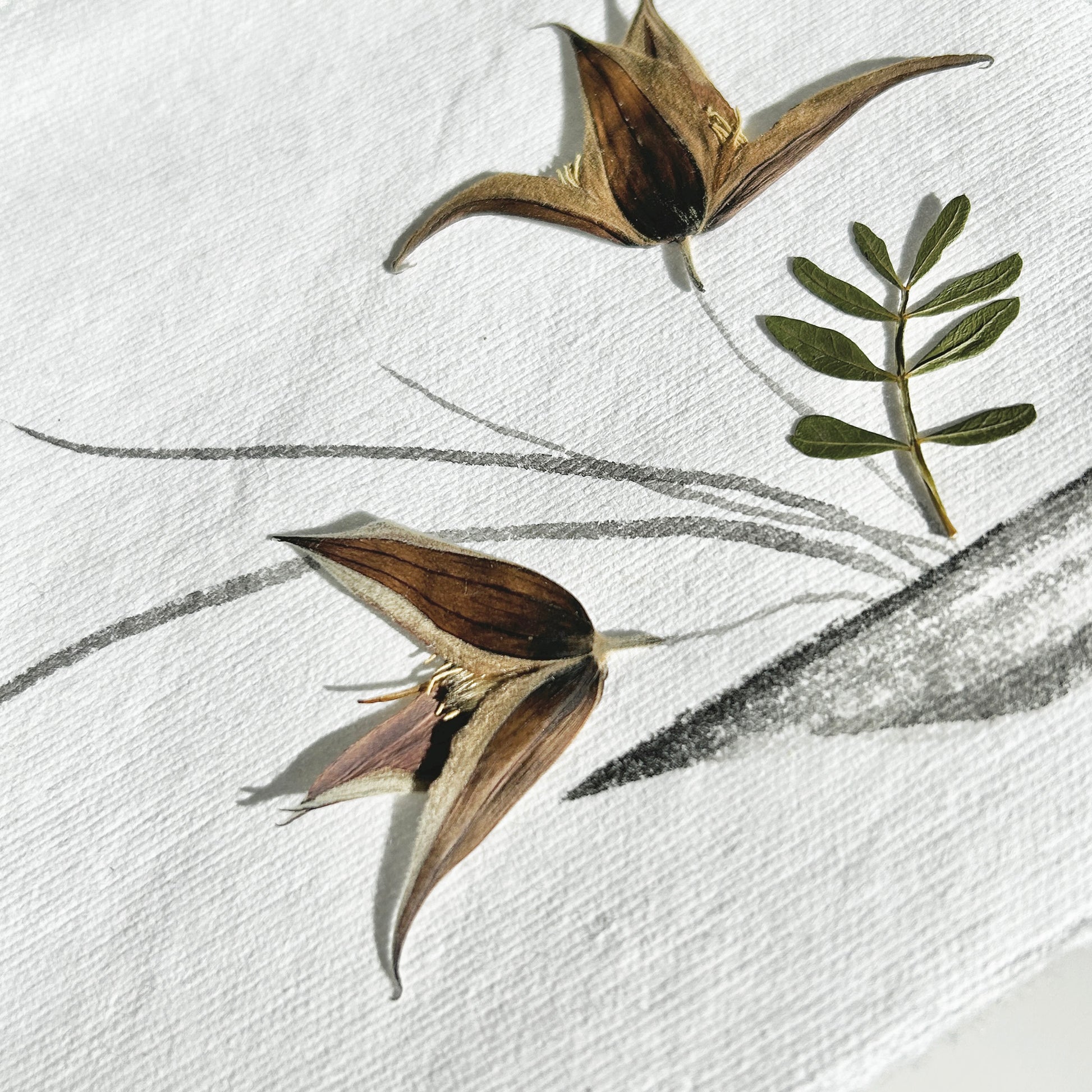 Cette pièce, Ikebana 019, est composée simplement des fleurs de clematis et d'un petit morceau mystère que j'ai réalisé en herbier. Avec Lavis-Ikebana, toutes les fleurs et plantes ont leur valeur et leur beauté à mes yeux, et se transforment en véritables œuvres d'art.
