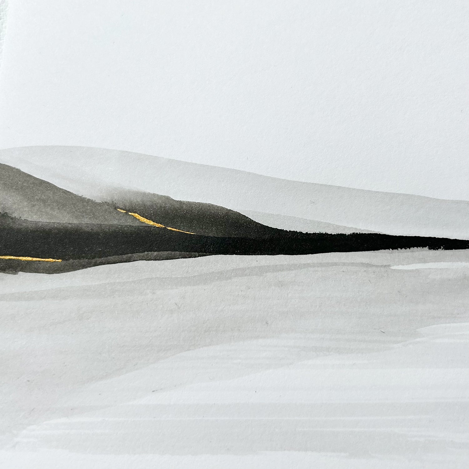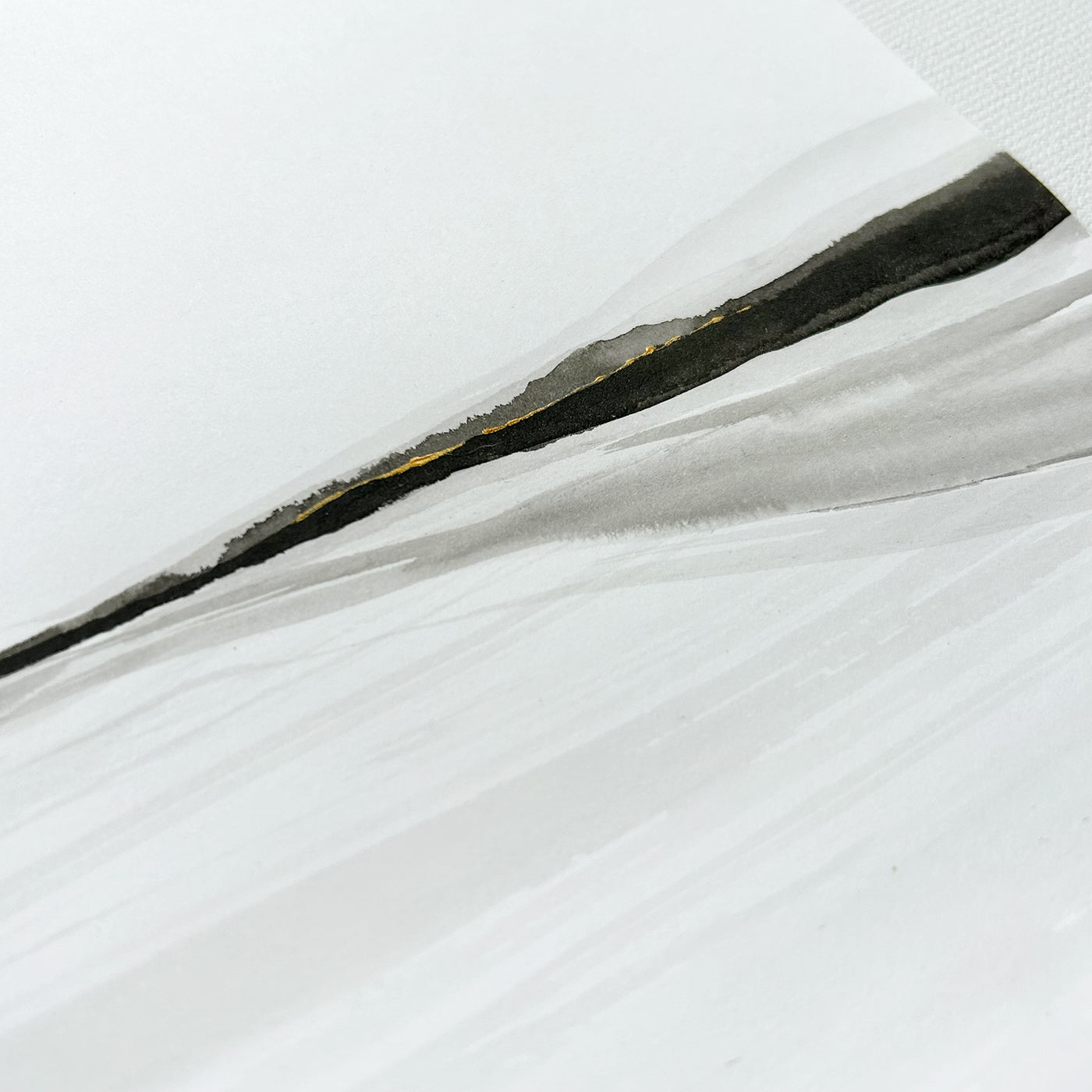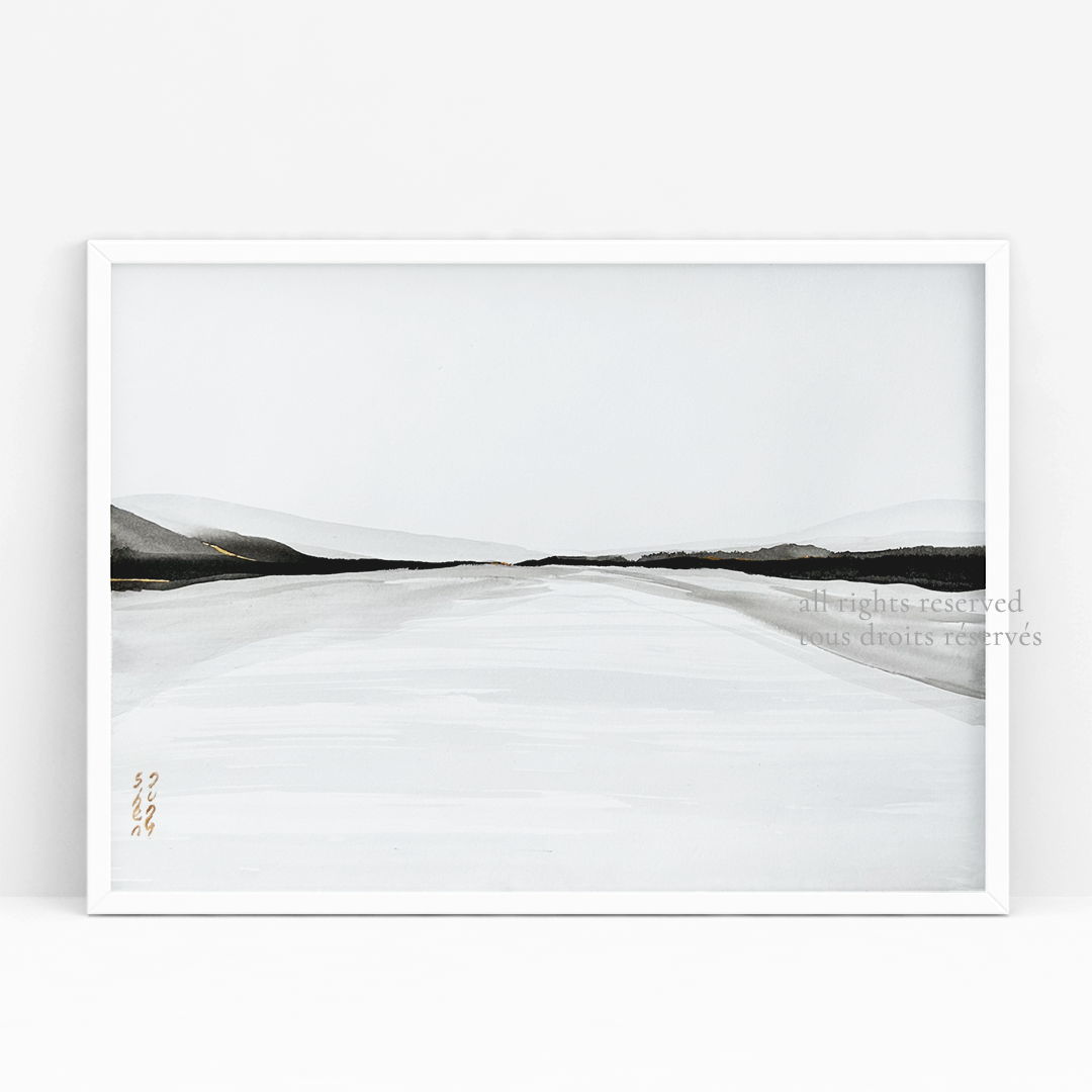 Ce tableau délicat réalisé avec la technique du lavis sur un papier spécial évoque la spiritualité de l'encre de Chine ou Sumi-e japonaise, exprimant une ambiance de sérénité.