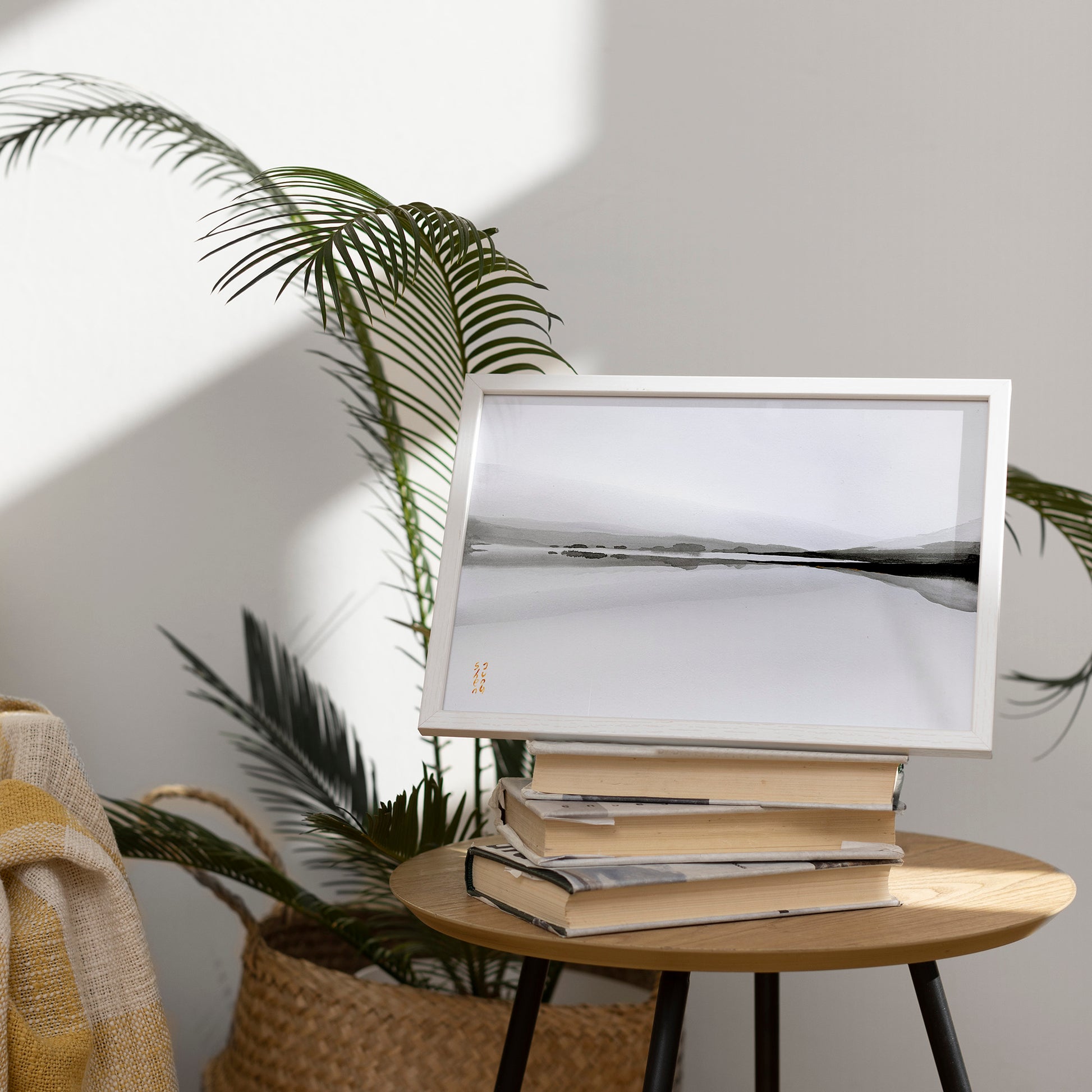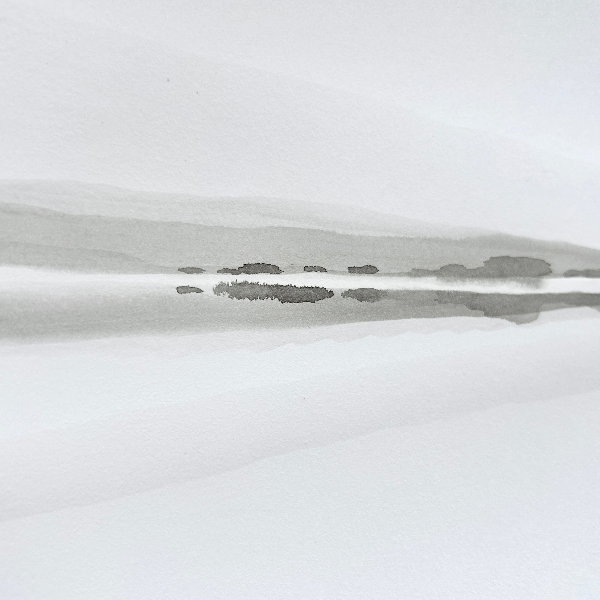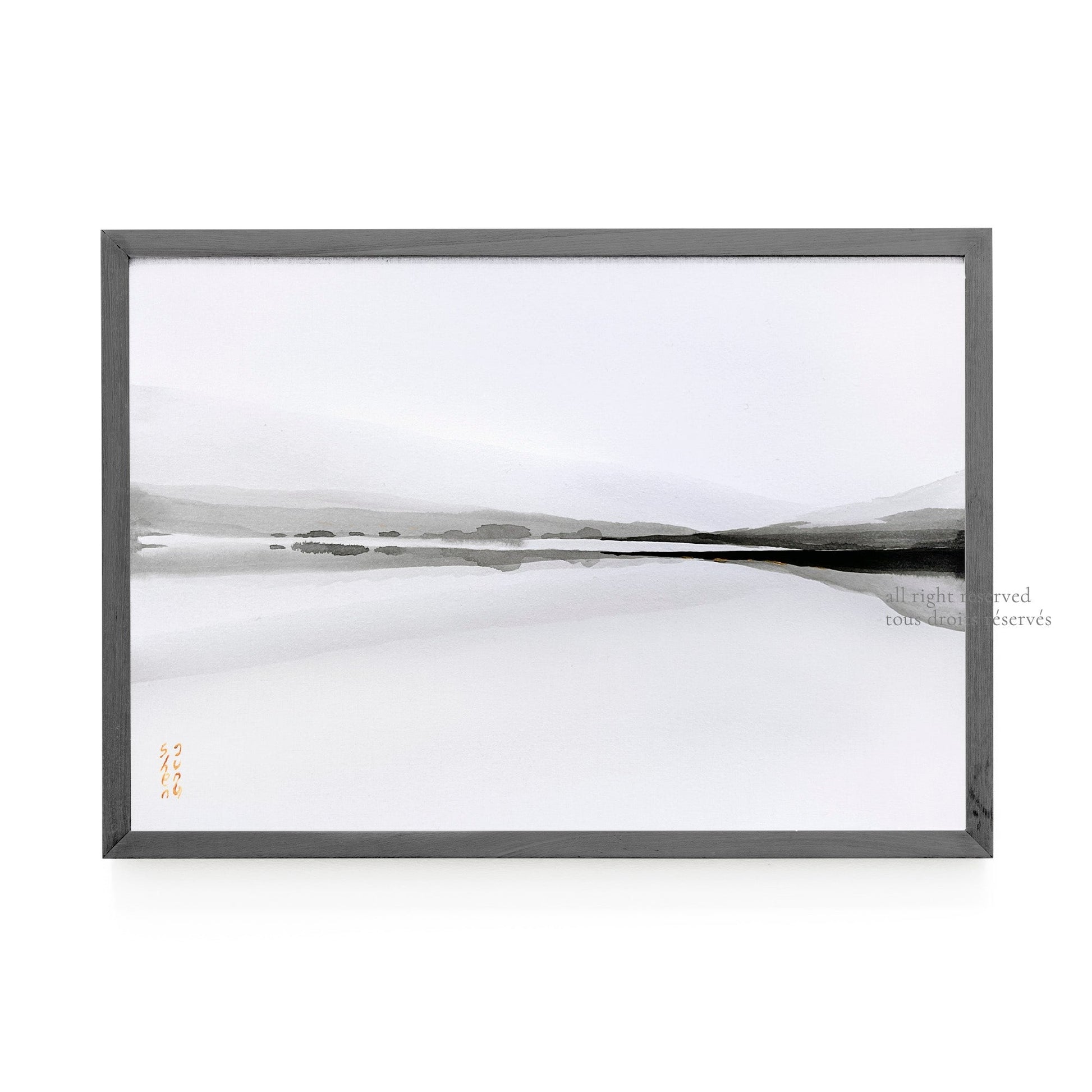 Ce tableau délicat réalisé avec la technique du lavis sur un papier spécial évoque la spiritualité de l'encre de Chine ou Sumi-e japonaise, exprimant une ambiance de sérénité.
