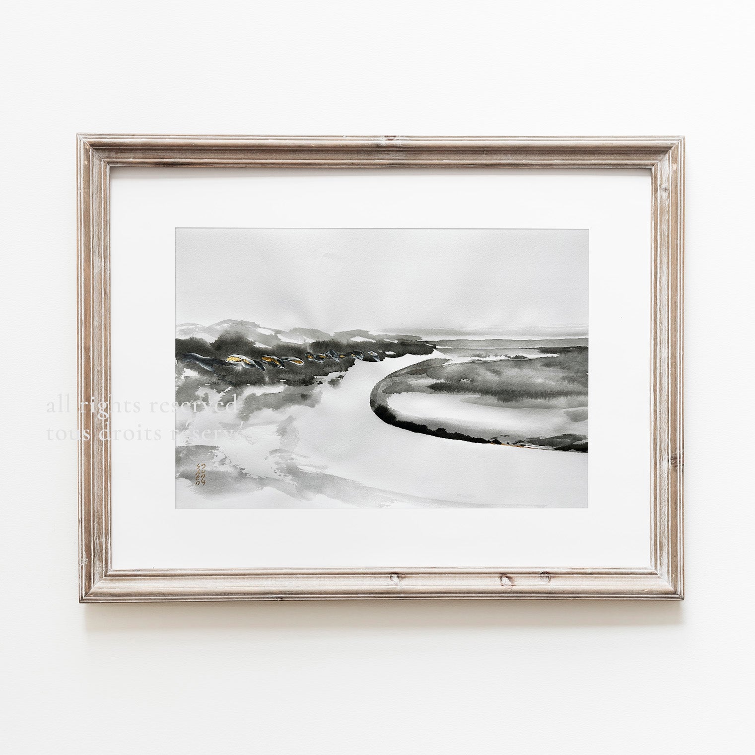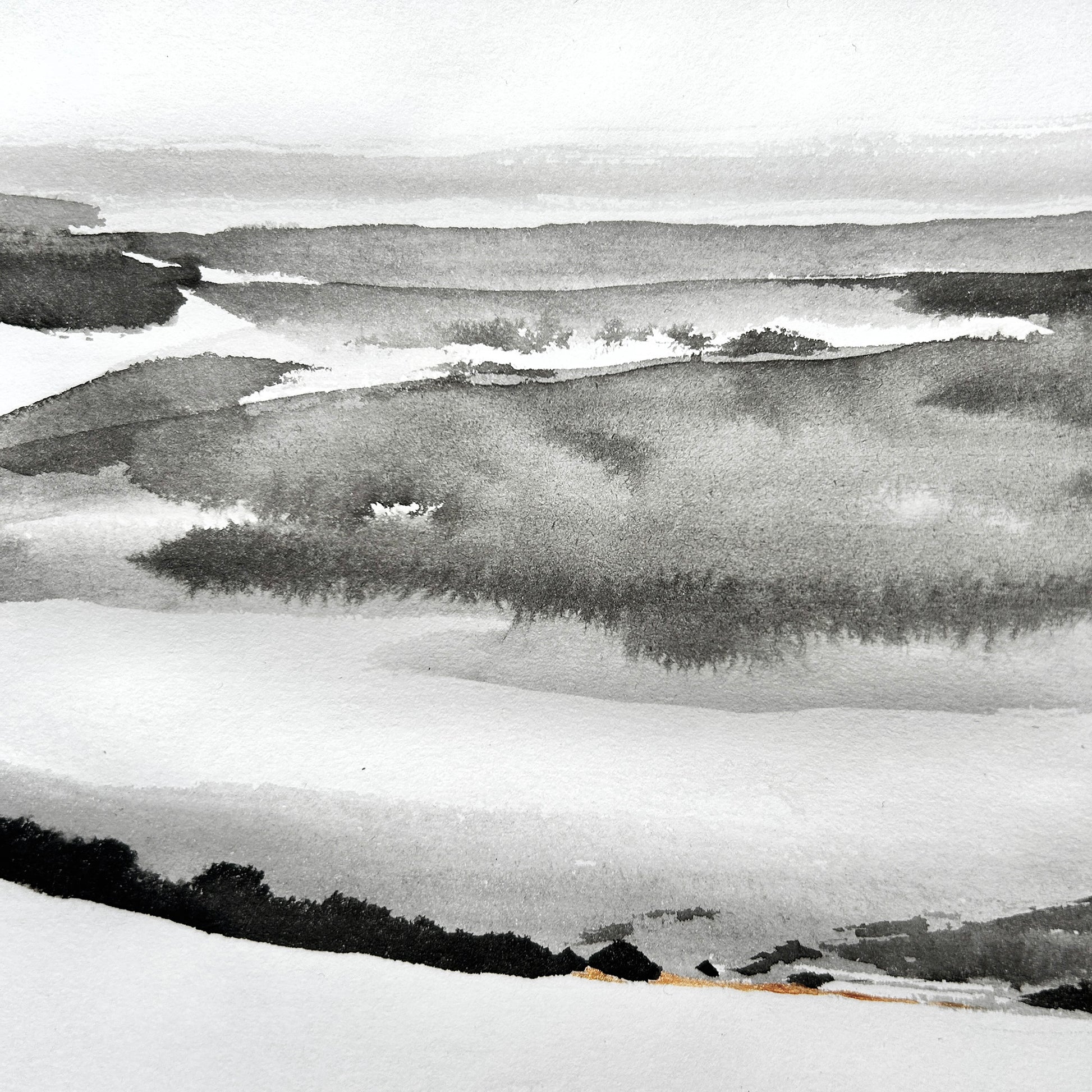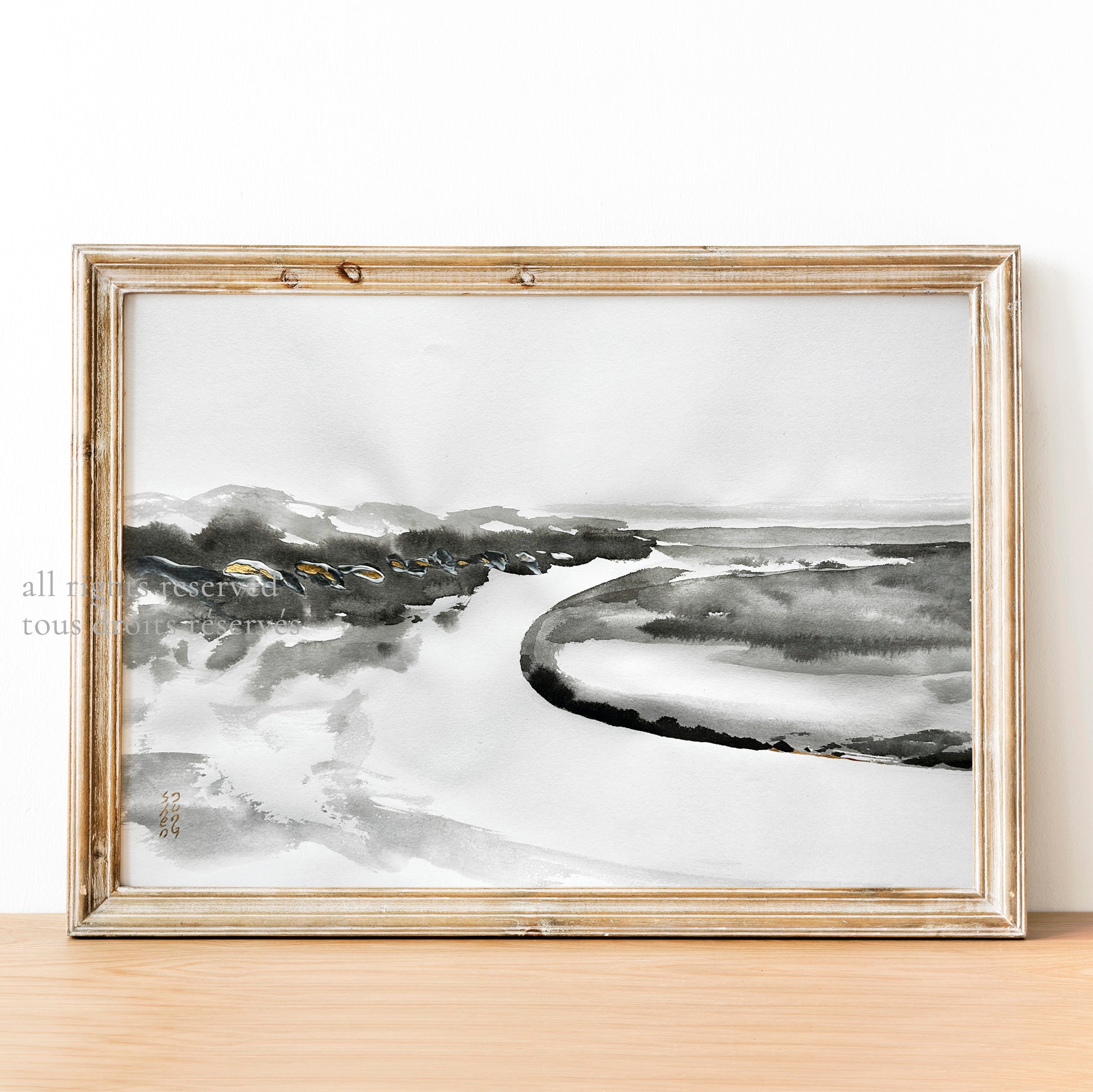Ce tableau délicat réalisé avec la technique du lavis sur un papier spécial évoque la spiritualité de l'encre de Chine (ou Sumi-e japonaise), exprimant une ambiance de sérénité.