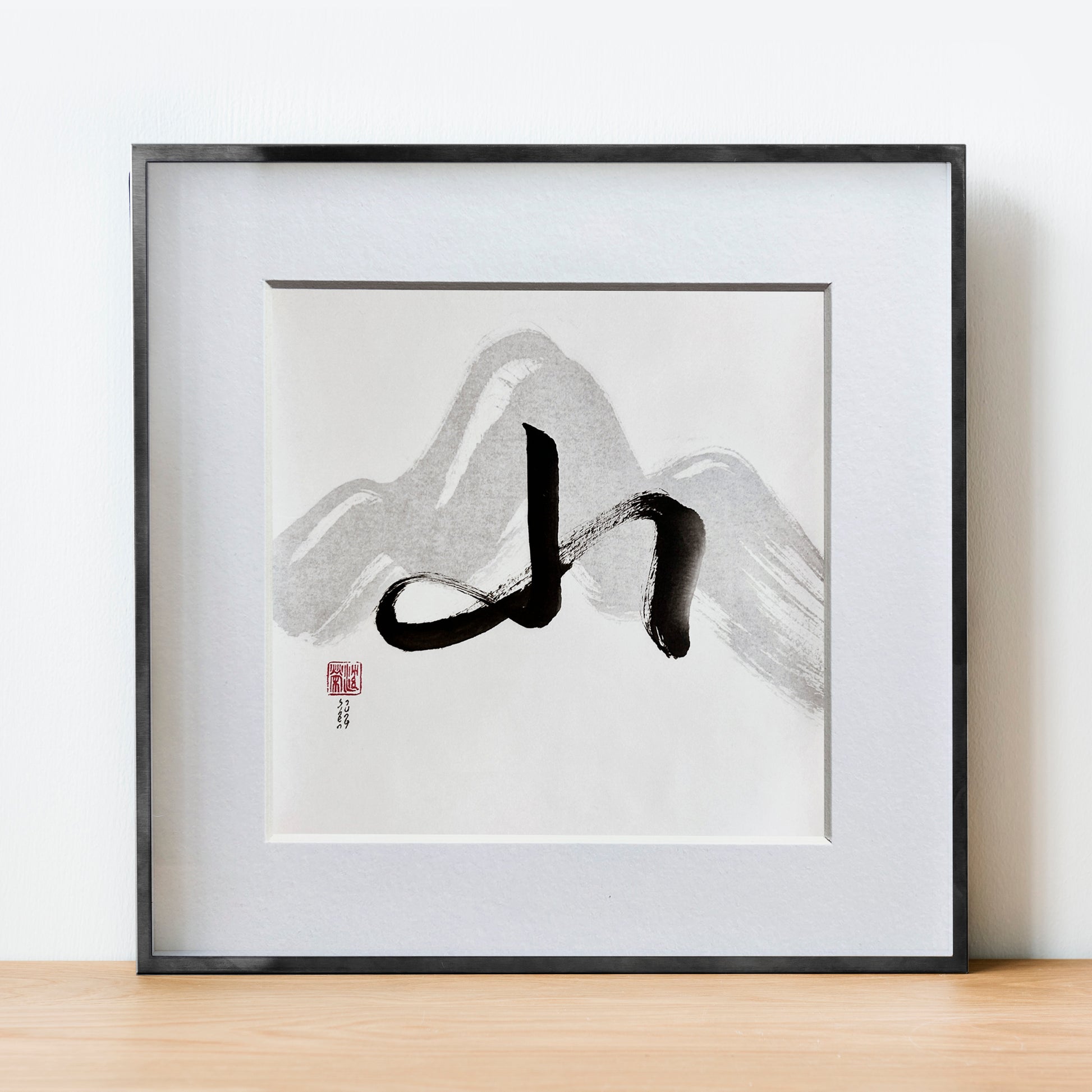 Cette peinture, écriture contient deux " montagnes " ( Shān山 ) superposées. La calligraphie Shān est marouflée sur un papier avec son motif idéogramme.