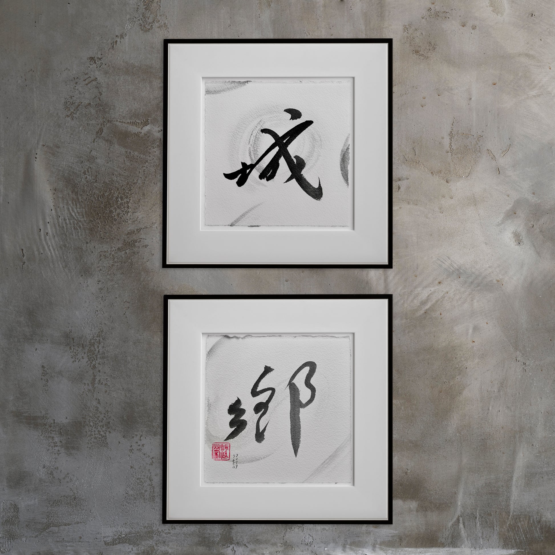 Diptyque Calligraphie. Le caractère de la ville, en haut, et celui de la campagne, en bas, signifient ensemble "village". Le dessin évoque une philosophie chinoise de la "quadrature du cercle"...